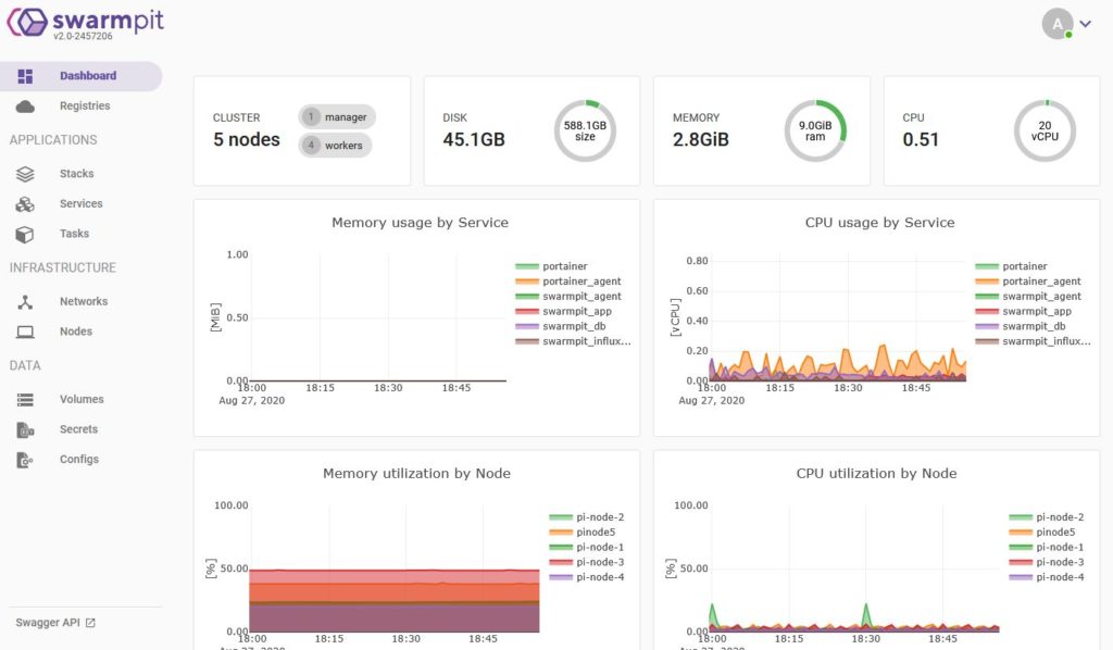 Then I started wanting to track how the nodes of the cluster were performing and using resources. I was hoping Portainer had what I was looking for but it didn’t. I have Nagios monitoring temp, drive space, and memory usage. I still wanted something that presented a little better. So after some research I found Swarm Pit. This has some of the same features but it listed out node usage over time, the cluster resources all together, and the breaks it out by node. Swarm Pit uses multiple containers to make it work. It has the app, an agent, and two db containers. The app has to run on the leader so I have Portainer and Swarm Pit as the only things running on the leader node. I like being able to bring this up and view the a simple interface that has the last hour along with current usage. Below are a few pics of the Swarm Pit interface.